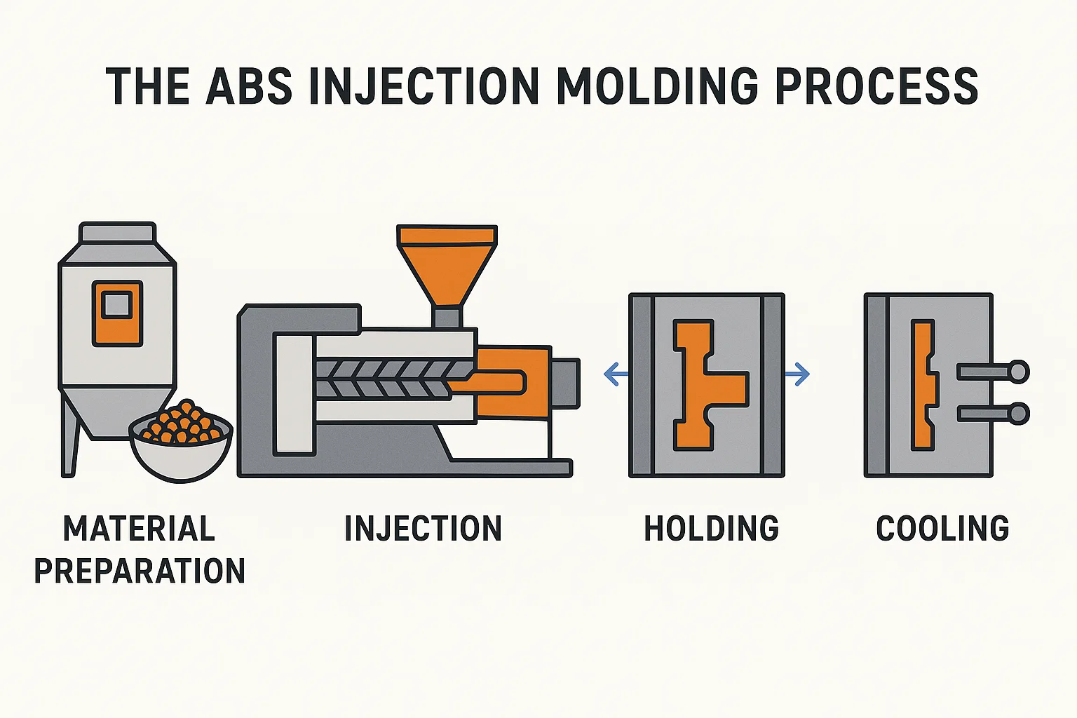 Injektionsstøbningsprocessen for ABS, mens den grundlæggende ligner støbning af anden termoplast, kræver omhyggelig opmærksomhed på specifikke parametre for at udnytte ABS's unikke egenskaber og sikre dele af høj kvalitet. Processen er cyklisk og producerer en ny del med hver komplet cyklus.