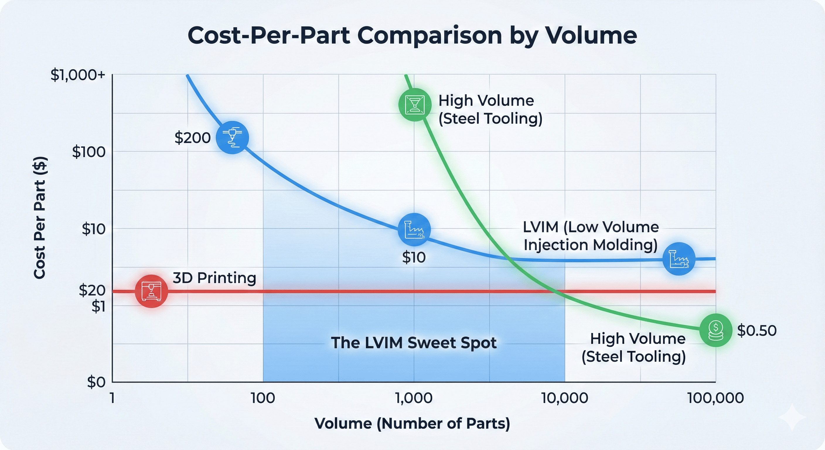 Tænk på LVIM som masseproduktionens adrætte fætter. Mens traditionel støbning er besat af "millioner af cyklusser", er LVIM designet til 100 til 10.000 enheder rækkevidde.