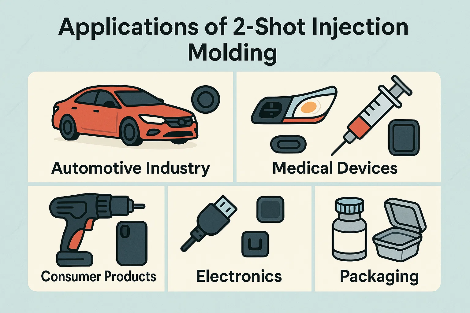 Den unikke kombination af funktionalitet, æstetik og effektivitet, der tilbydes ved 2-shot-injektionsstøbning, gør det til en foretrukken produktionsmetode på tværs af et bredt spektrum af industrier. Dens evne til at skabe en enkelt, multimaterialet del i en cyklus har løst komplekst design- og samlingsudfordringer, hvilket har ført til forbedret produktkvalitet og ydeevne i de følgende sektorer.