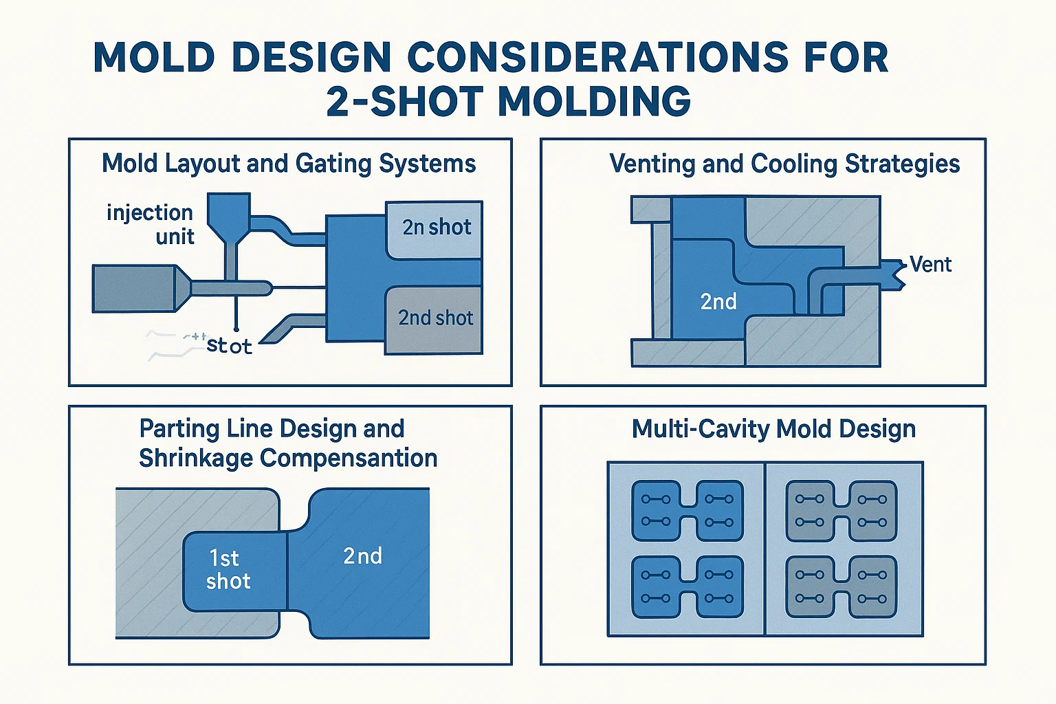 Til produktion med høj volumen kan 2-shot-forme designes med flere hulrum til at producere flere dele pr. Cyklus. Dette øger effektiviteten markant, men tilføjer også et lag af kompleksitet til formdesignet. Runner -systemerne til begge skud skal være omhyggeligt afbalanceret for at sikre, at alle hulrum er fyldt jævnt og samtidig. Dette forhindrer variationer i dels kvalitet fra det ene hulrum til det næste. Mens en multi-cavity 2-shot-form har en meget højere indledende omkostning, gør de langsigtede besparelser i produktionstid og arbejdskraft det til en omkostningseffektiv løsning til massefremstilling.