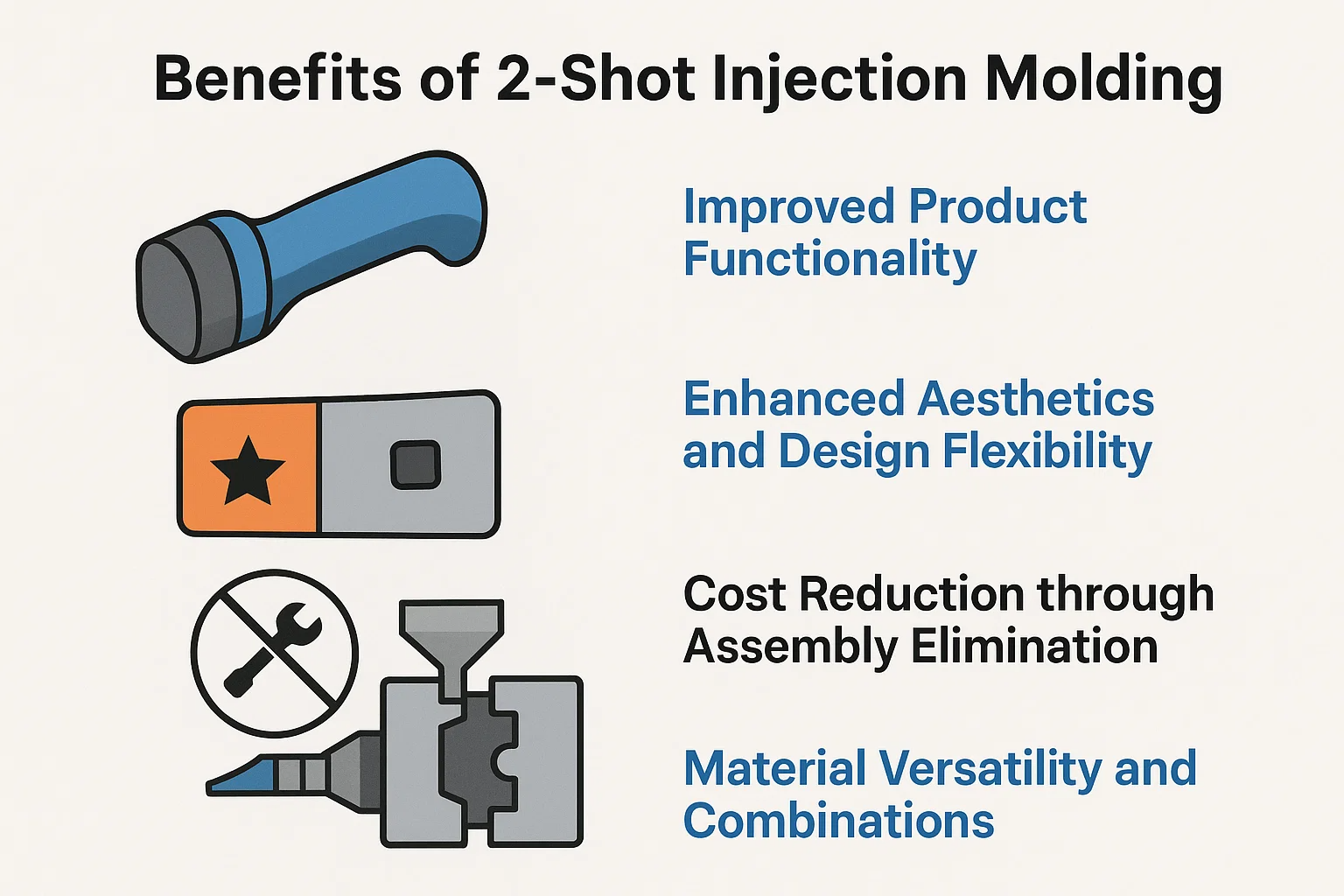Det strategiske valg til at anvende 2-shot-injektionsstøbning går ud over blot teknisk sofistikering; Det leverer en række konkrete fordele, der dramatisk kan påvirke et produkts ydelse, omkostningseffektivitet og markedsappel. Ved at integrere to separate produktionstrin i en enkelt, problemfri proces løser 2-shot-støbning mange af de udfordringer, der er forbundet med multikomponentprodukter.