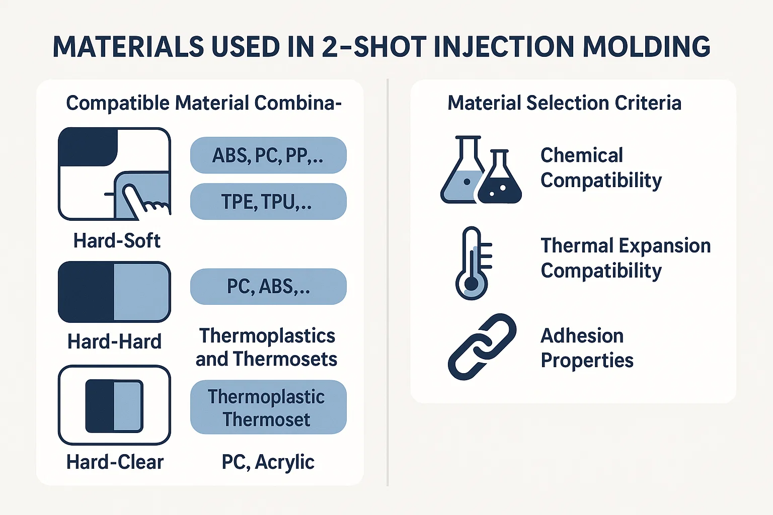 Alsidigheden af 2-shot-støbning defineres af den brede vifte af materielle parringer, den kan håndtere. Disse kombinationer er typisk kategoriseret baseret på egenskaberne for de materialer, der bruges: