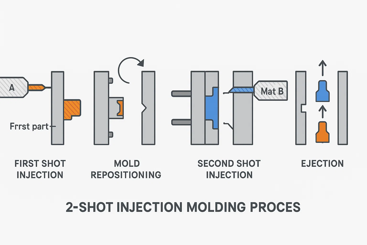 Det grundlæggende princip for 2-shot-injektionsstøbning er den sekventielle injektion af to materialer i en specielt designet form. Processen følger generelt disse centrale trin: