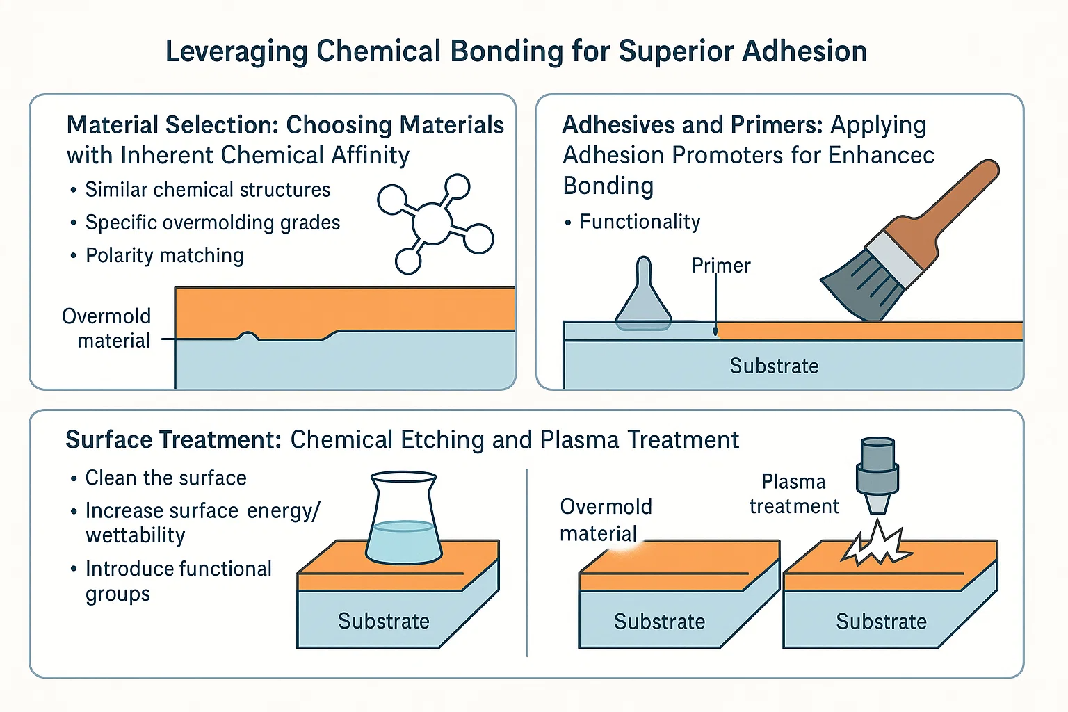 Kemisk priming/adhæsionspromotorer: Til udfordrende materialekombinationer, Primere eller adhæsionspromotorer kan påføres på substratoverfladen. Disse kemikalier fungerer som en bro og danner en binding med både underlaget og det overmoldmateriale. Dette er almindeligt i gummi-til-plastisk eller metal-til-plastisk overmoldning.