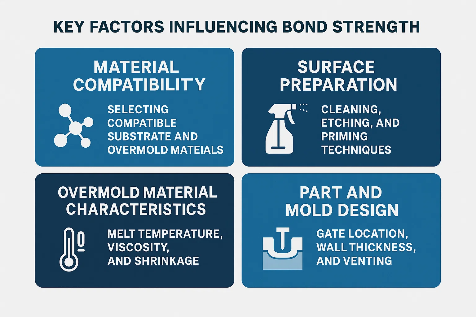 Krympehastigheder: Materialer krymper, mens de afkøles. Hvis overmold- og substratmaterialerne har markant forskellige Krympehastigheder , interne spændinger kan opbygge, hvilket fører til delaminering eller revner over tid, især ved kanter eller hjørner. Ingeniører vælger omhyggeligt par med lignende eller komplementær krympningsadfærd.