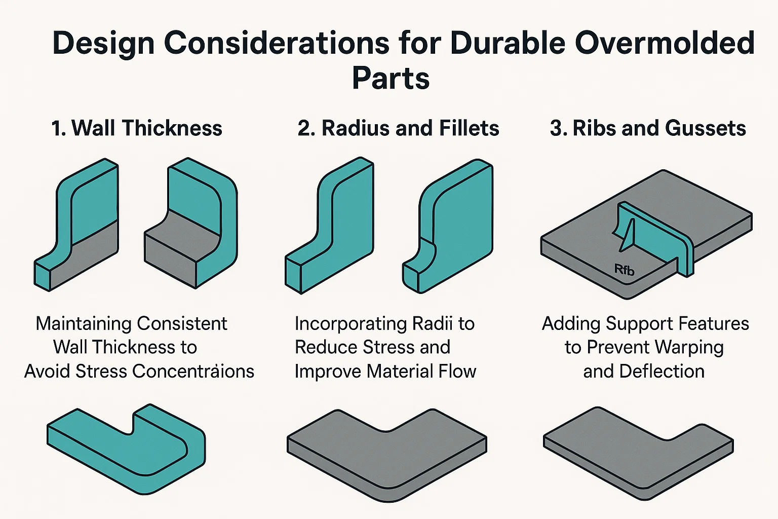 Forebyggelse af warpage: Store, flade områder med overmoldet materiale er tilbøjelige til at fordrive, når de afkøles. Hvis de overmoldede fordriver væk fra underlaget, vil bindingen uundgåeligt mislykkes. Ribben er tynde, understøttende vægge tilsat til den ikke-kosmetiske side af delen. De øger stivhed uden at tilføje betydelig masse eller kræver overdreven vægtykkelse.