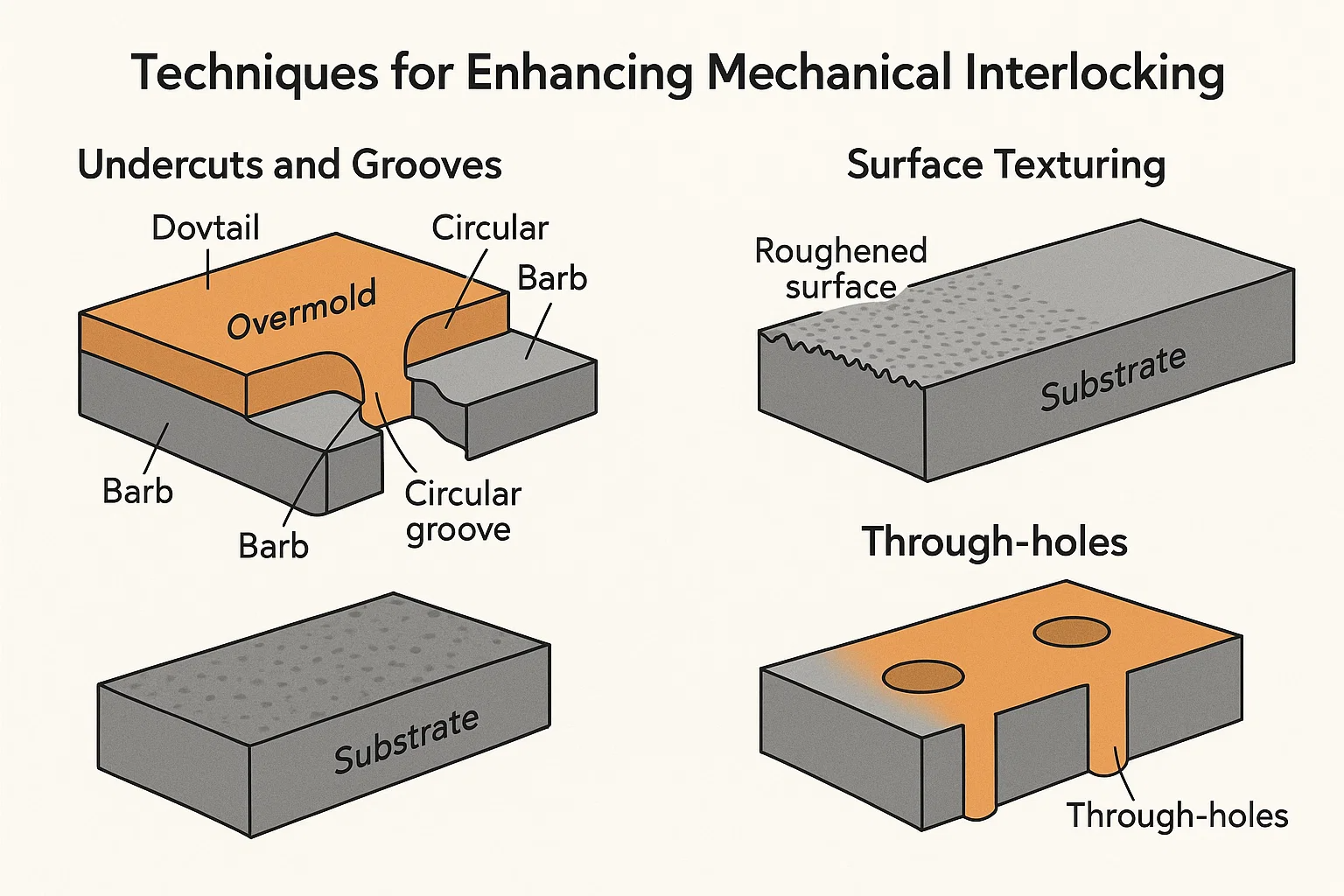 Undergrav, riller og huller: Som diskuteret i mekanisk sammenlåsning er det afgørende for at skabe fysiske ankre for det overmoldede materiale at inkorporere disse funktioner i substratdesignet. Disse funktioner skal være designet med passende trækvinkler for at muliggøre let at afholdes uden at beskadige den overmålte del.