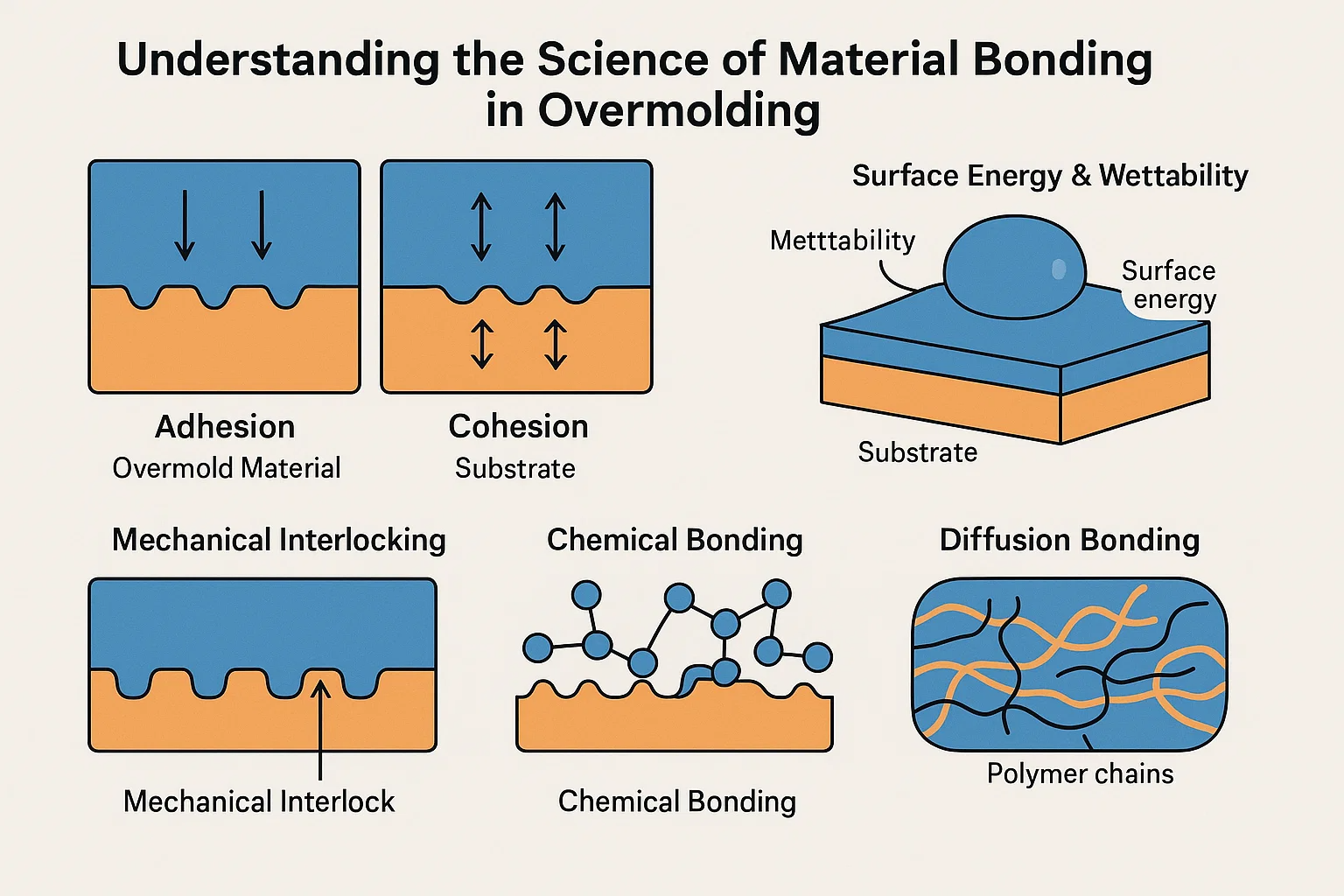 At opnå en permanent bånd i overmoldning er ikke magi; Det er en videnskab, der er forankret i, hvordan materialer interagerer på et mikroskopisk niveau. For virkelig at mestre overformning er vi nødt til at forstå de grundlæggende principper for adhæsion og samhørighed , og hvordan de anvender på grænsefladen mellem dit substrat og overmålte materiale.