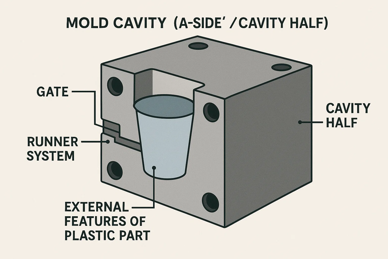 De Formhulrum , også kendt som "a-side" eller "hulrumshalvdel" er den komponent, der danner eksterne funktioner af plastdelen. Det er den ydre skal eller beholder, at de smeltede plastfylder. Ved hjælp af plastikkopanalogien ville hulrummet danne ydersiden af koppen, inklusive dens læbe og ydre vægge.