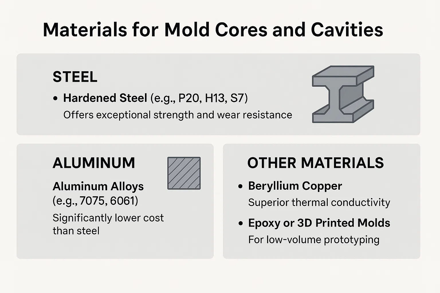 Materialet, der er valgt til formkernen og hulrummet, er kritisk, da det direkte påvirker formens holdbarhed, omkostninger og evne til at producere dele af høj kvalitet effektivt. Valget afhænger af faktorer som den type plast, der er støbt, det krævede produktionsvolumen og kompleksiteten af deldesignet.