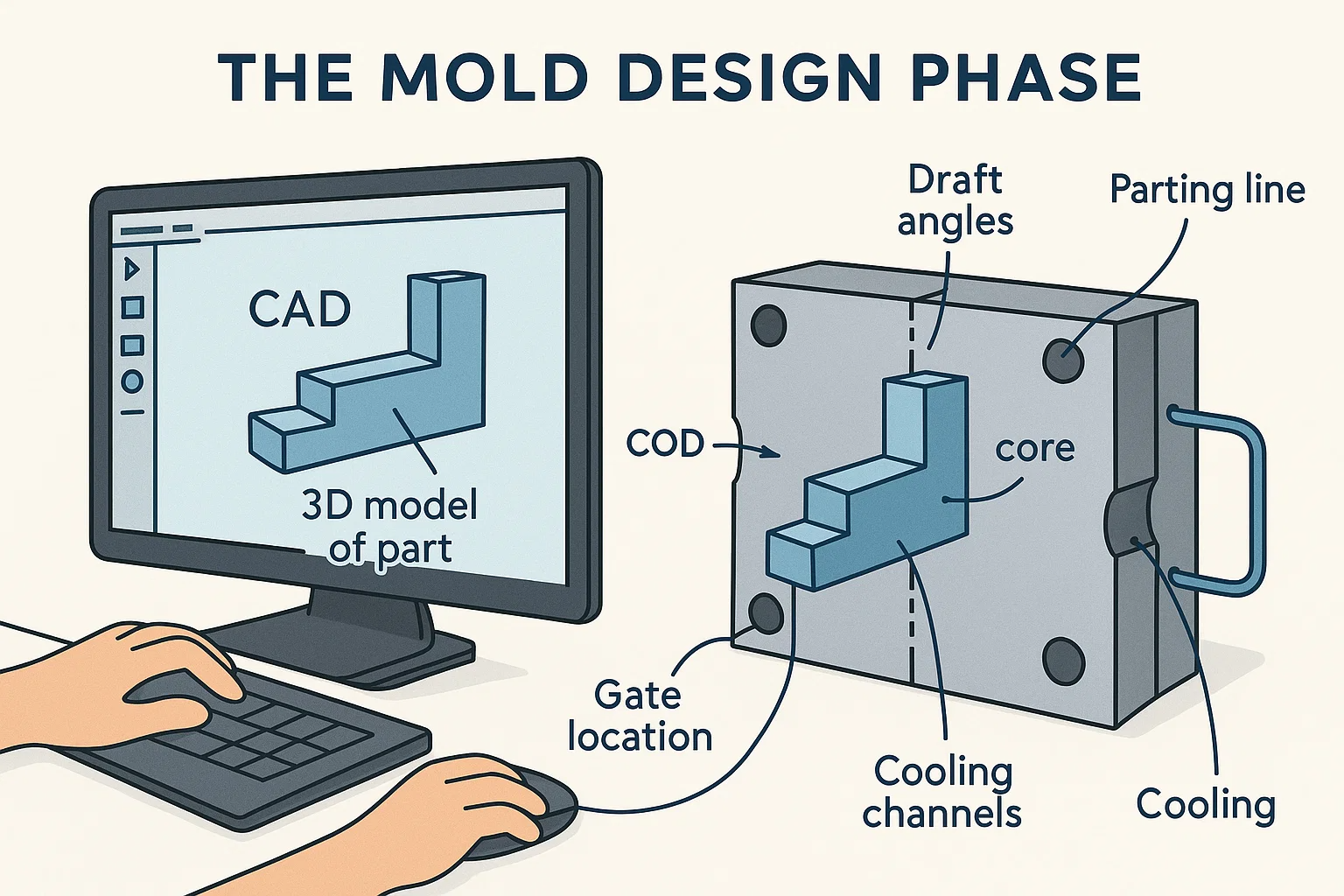 Med en klar forståelse af, hvordan injektionsstøbning omdanner rå plast til færdige dele, kan vi nu sætte pris på den største betydning af Molddesignfase . Det er her magien virkelig begynder, da abstrakte ideer og 2D -skitser udvikler sig til en præcis digital plan, der vil guide formenes fysiske skabelse. Det er en omhyggelig proces, hvor enhver kurve, vinkel og dimension af den endelige plastikmodeldel overvejes omhyggeligt og oversættes til formens geometri.